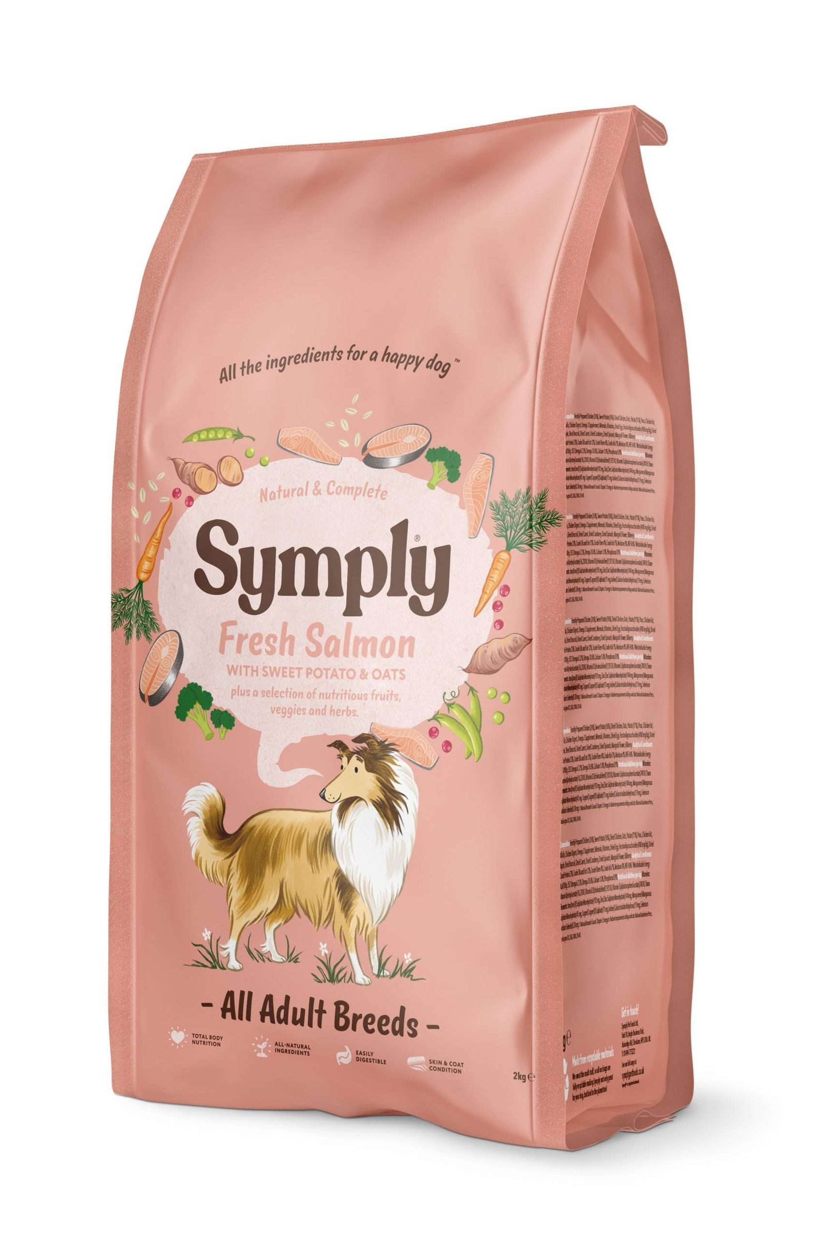 Succulent Scottish Salmon is effortlessly mixed with field fresh vegetables and botanicals to make a delicious complete and balanced meal for all adult dogs.