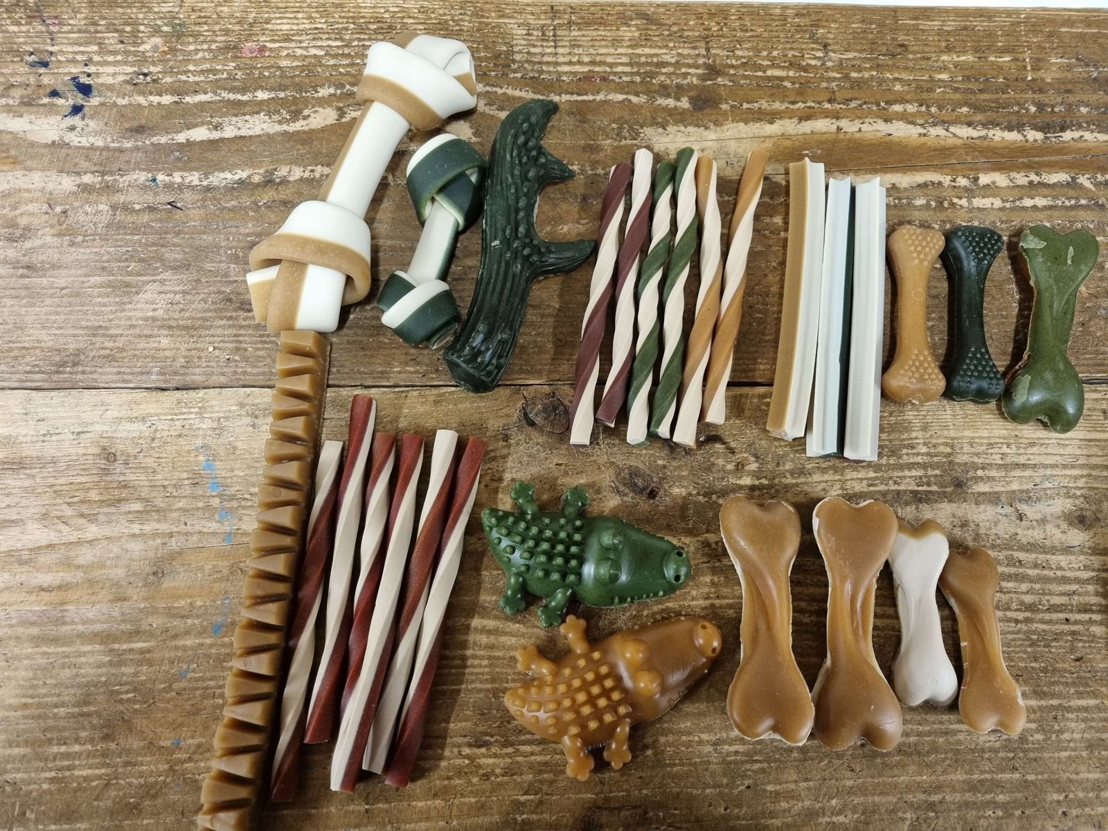 This box contains a mixture of our veggie treats. These are a great chew for dogs who have allergies, they are low in fat for dogs on a diet. They have no smell when being chewed.