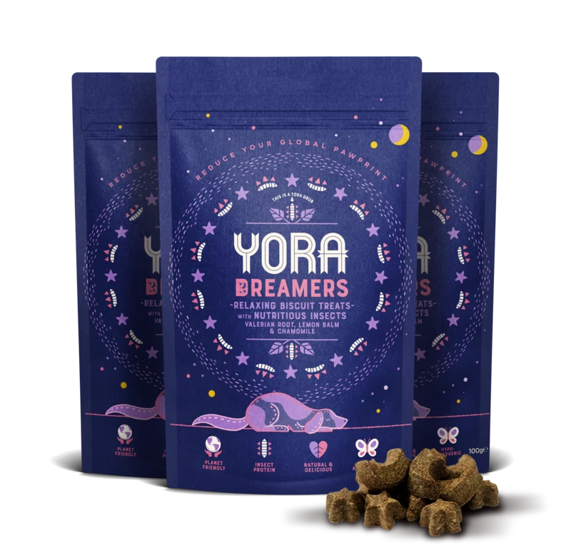Oats, Gram Flour, Insect Meal (20%), Vegetable Oil, Dried Spinach (2%), Valerian Root (0.5%), Lemon Balm (0.5%), Chamomile (0.5%).